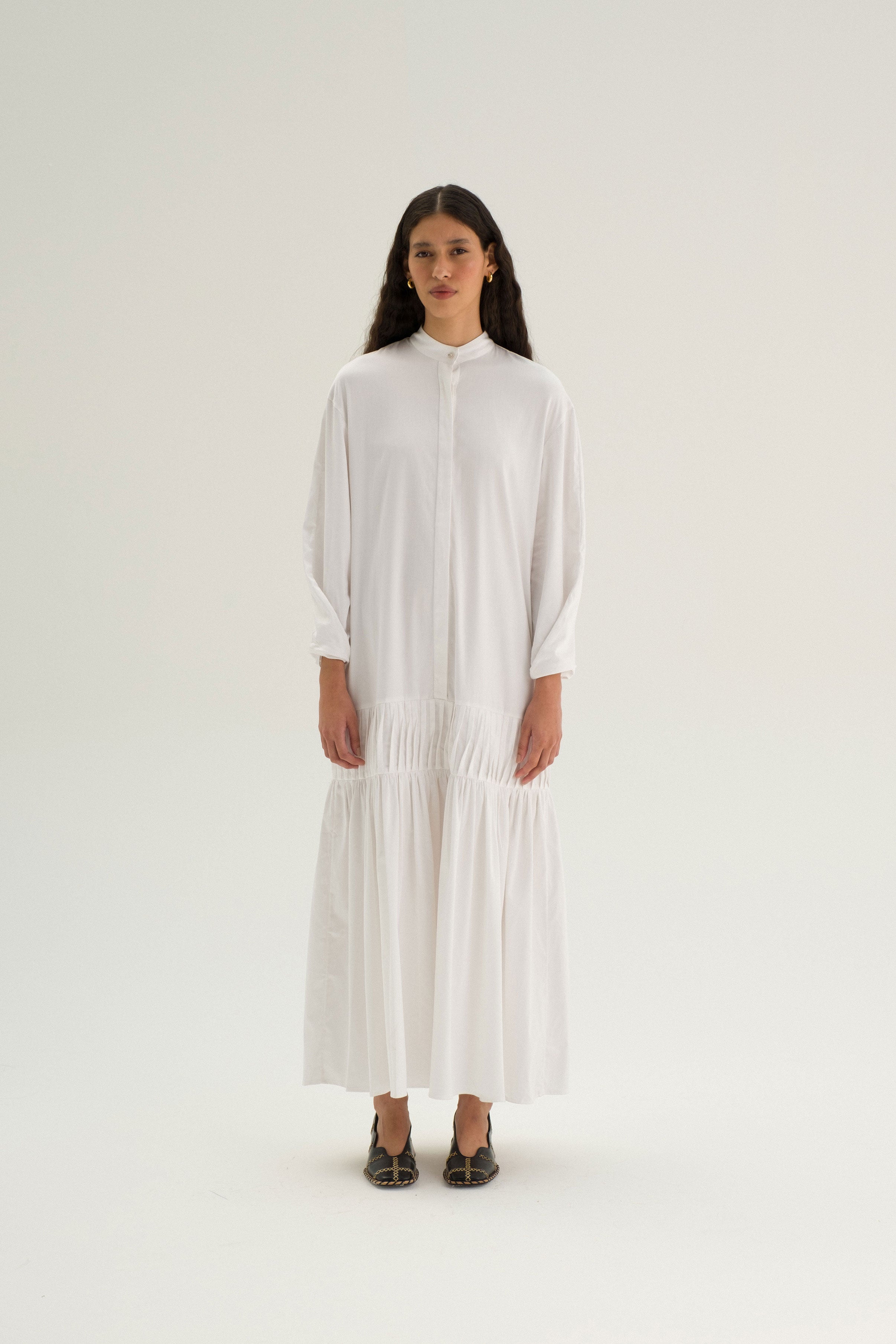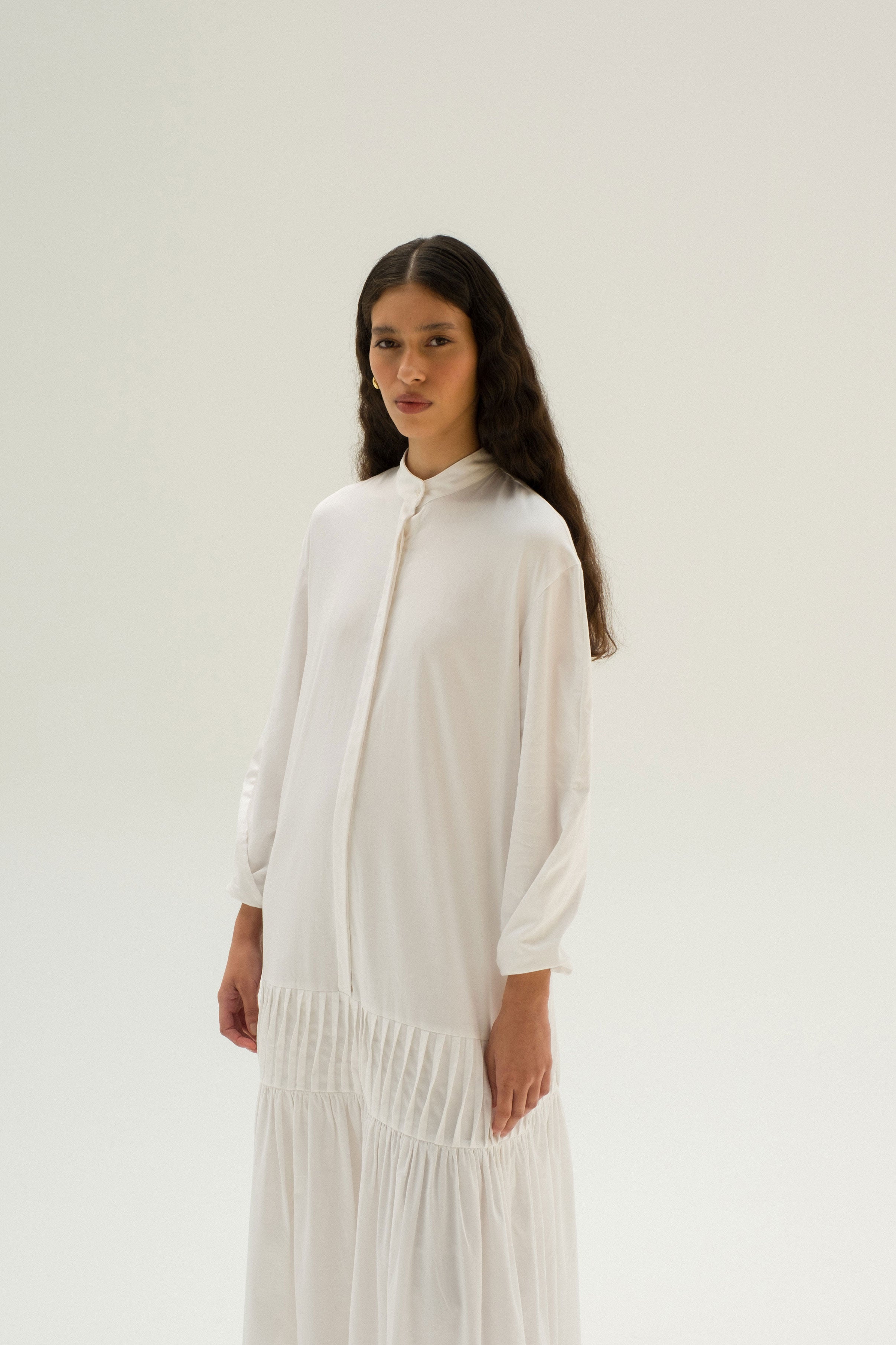 Vestido longo, reto e amplo. As mangas são compridas e arredondadas, afunilando no punho em um trabalho especial de sobreposição de pences. Possui detalhe em faixa na altura do quadril trabalhado em pregas torcidas que dão início à saia franzida. Fechamento por botões escondidos pela vista invisível.