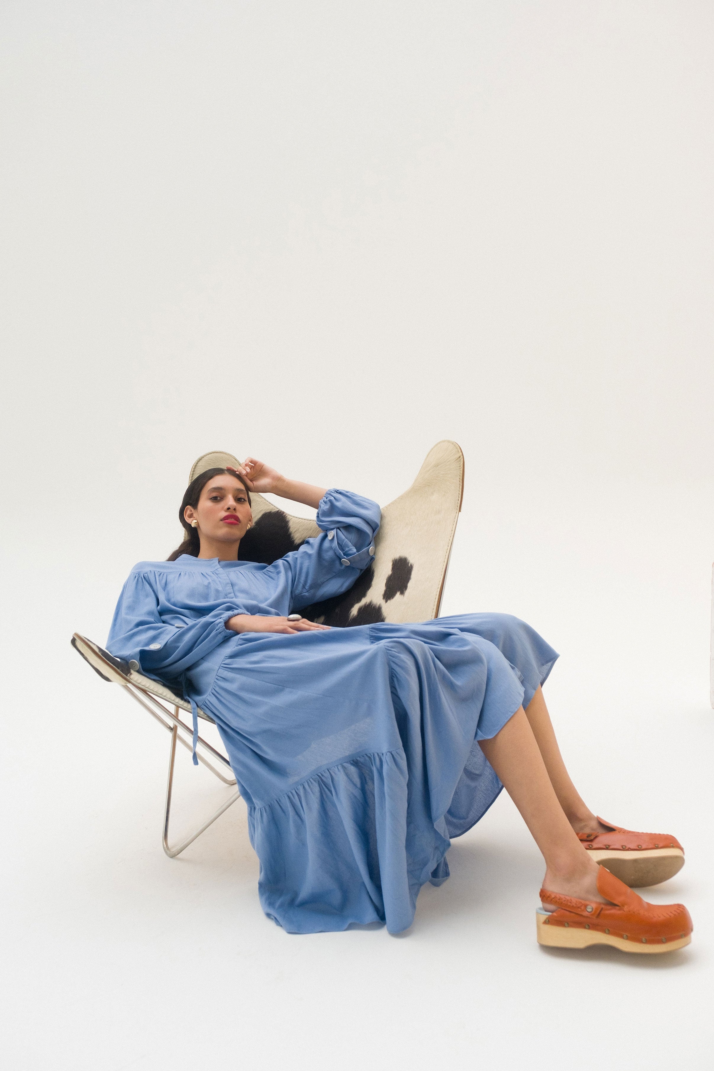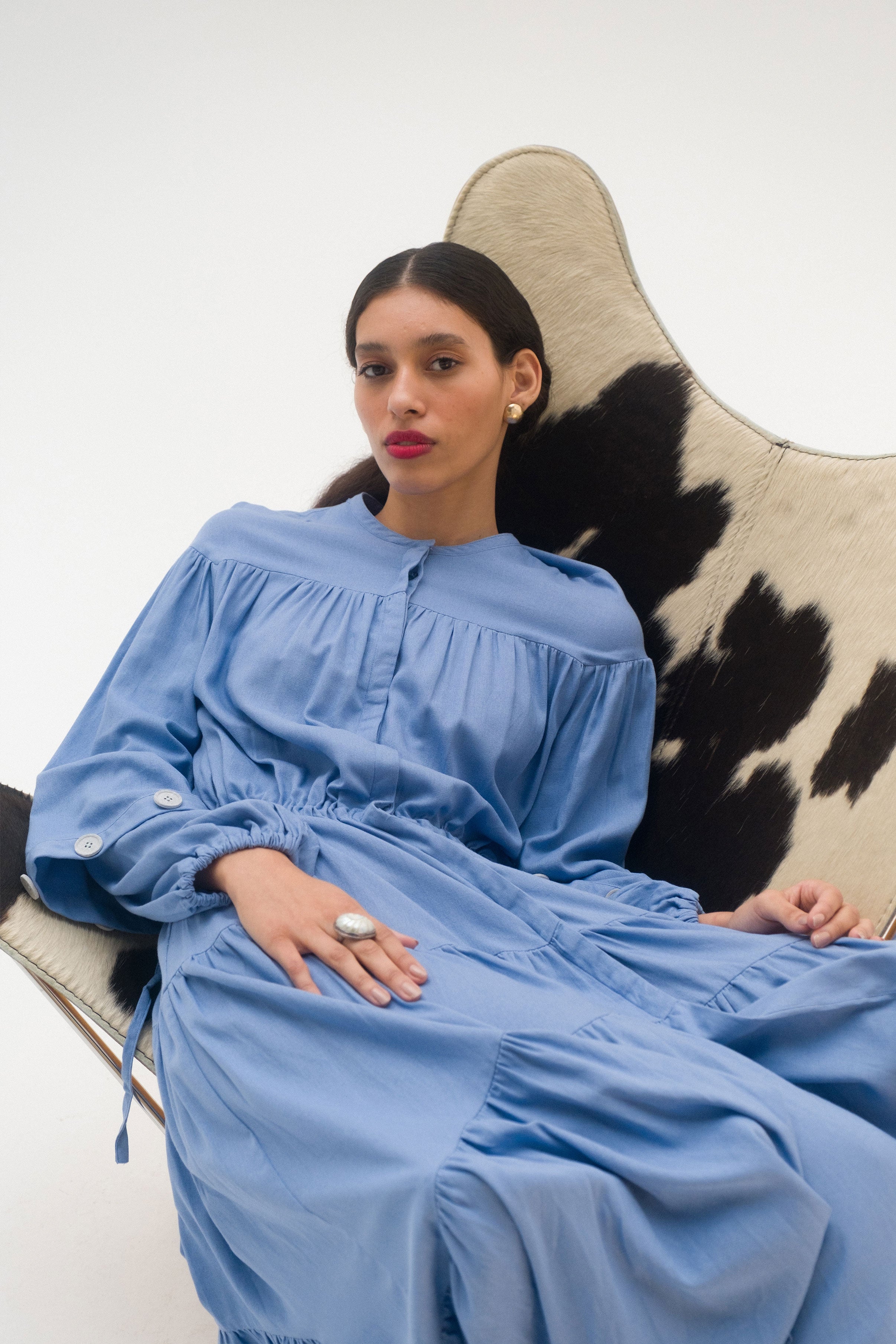 Vestido em modelagem evasê com recortes franzidos proporcionando movimento à peça. Possui comprimento assimétrico formado por uma costura arredondada na saia, sendo mais longo nas laterais. As mangas são compridas e predominantemente retas até o recorte que inicia um formato balão, com punho de elástico. Possui botões decorativos na divisão do recorte da manga e botões funcionais escondidos pela vista invisível. A cintura é ajustável pelas laterais por rolotês embutidos.
