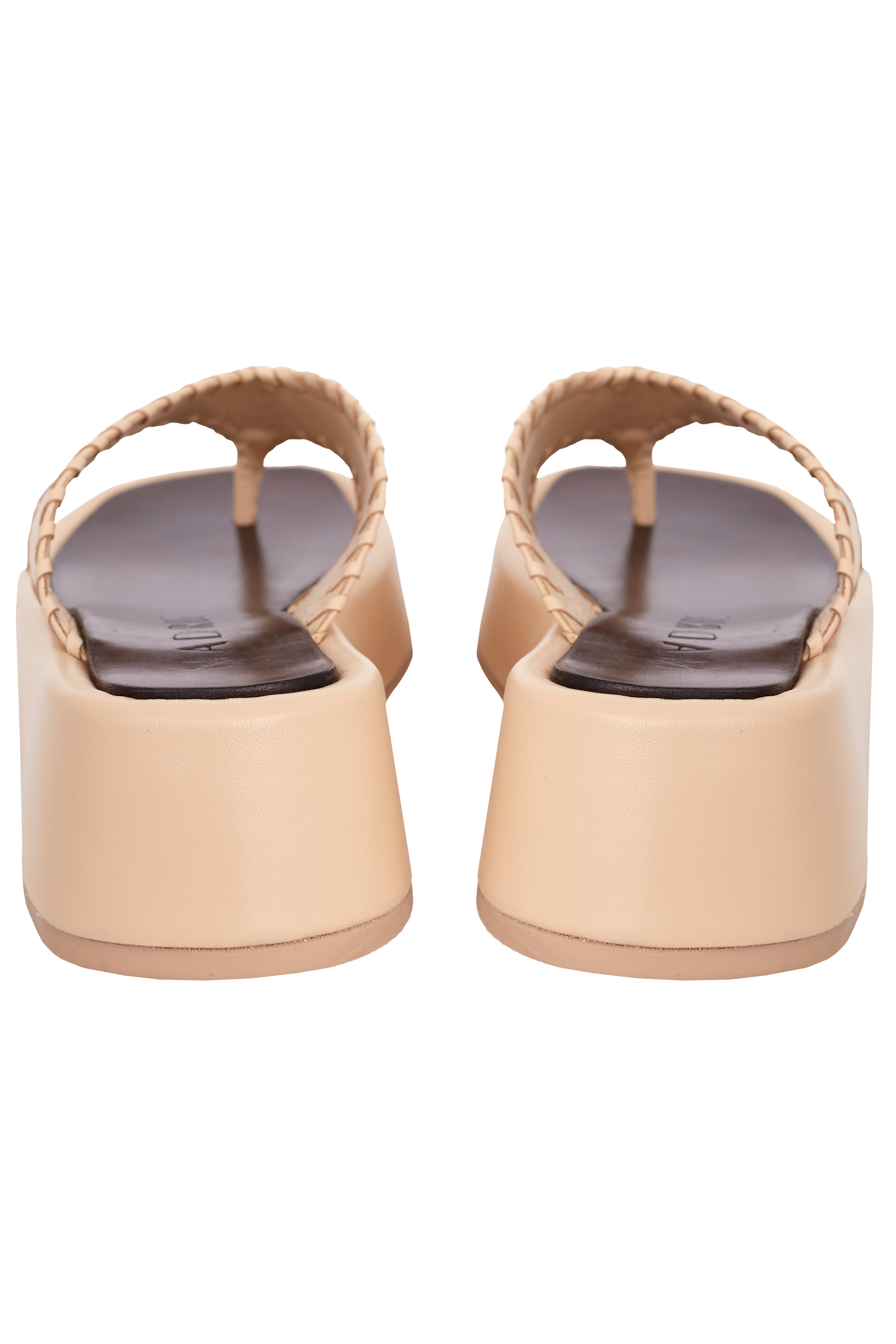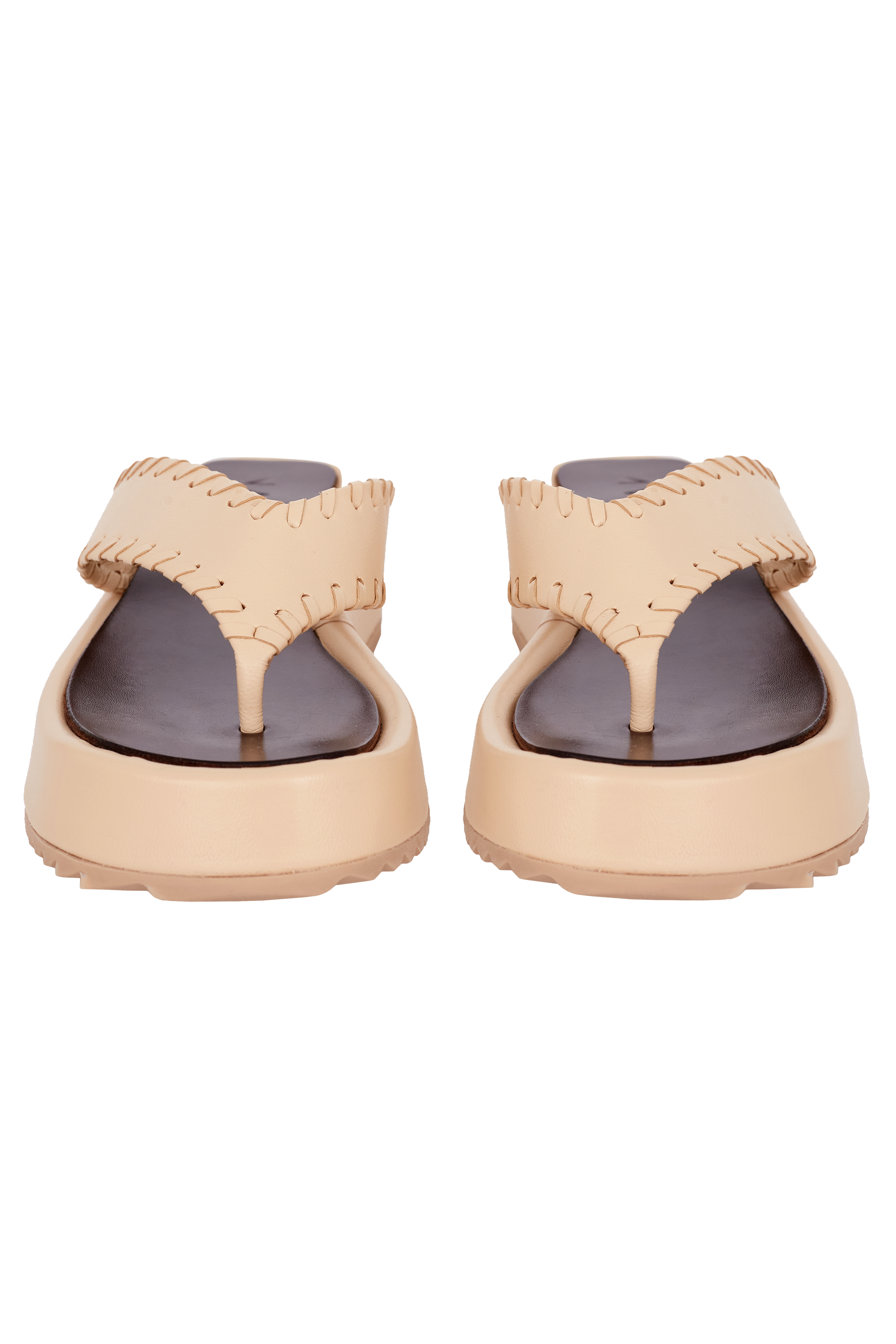 A sandália Flatform Alinhavo NADRUZ é toda forrada em couro macio. Possui plataforma inferior, encaixe de dedo com largas tiras alinhavadas ao redor do cabedal, além de palmilha em recouro.