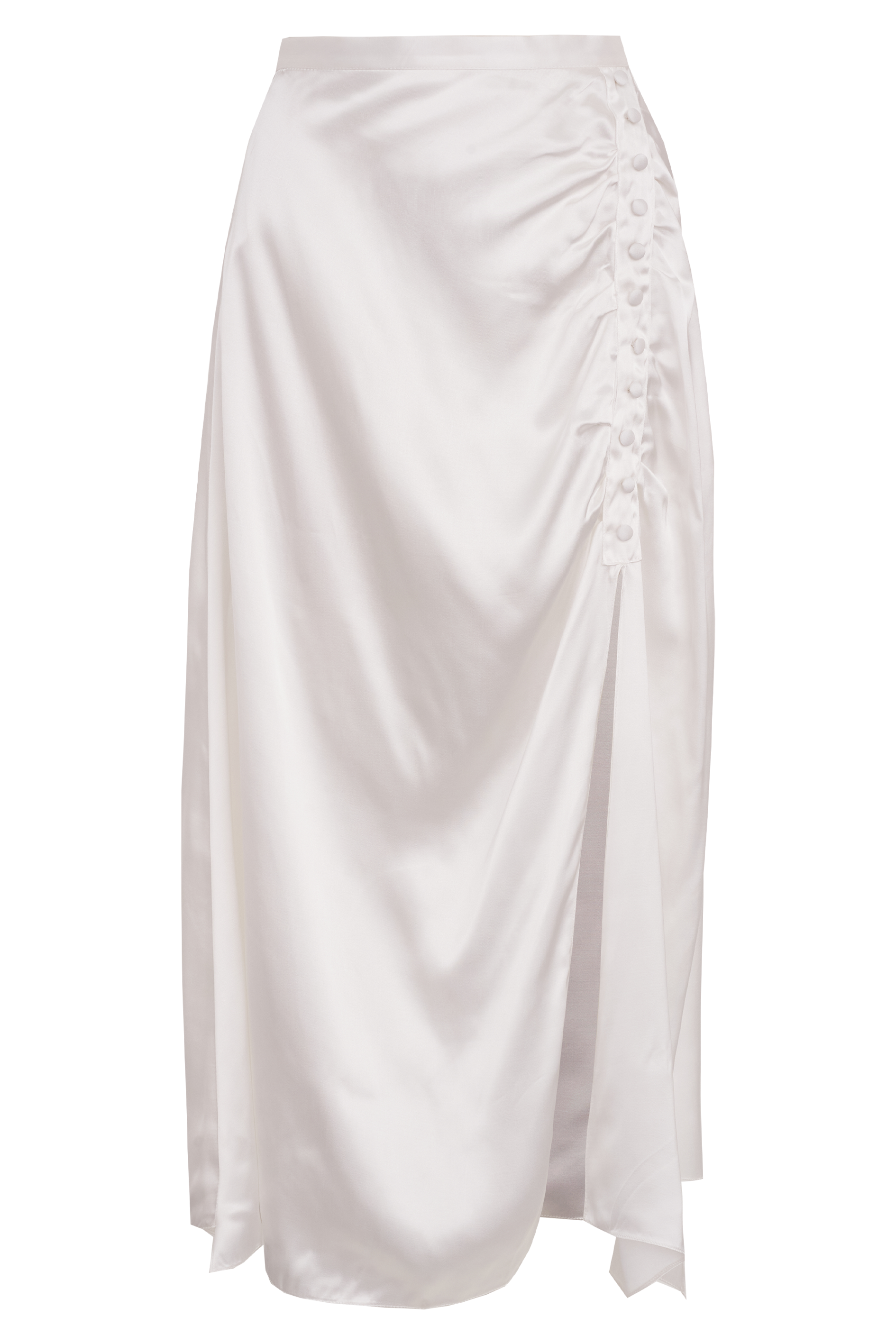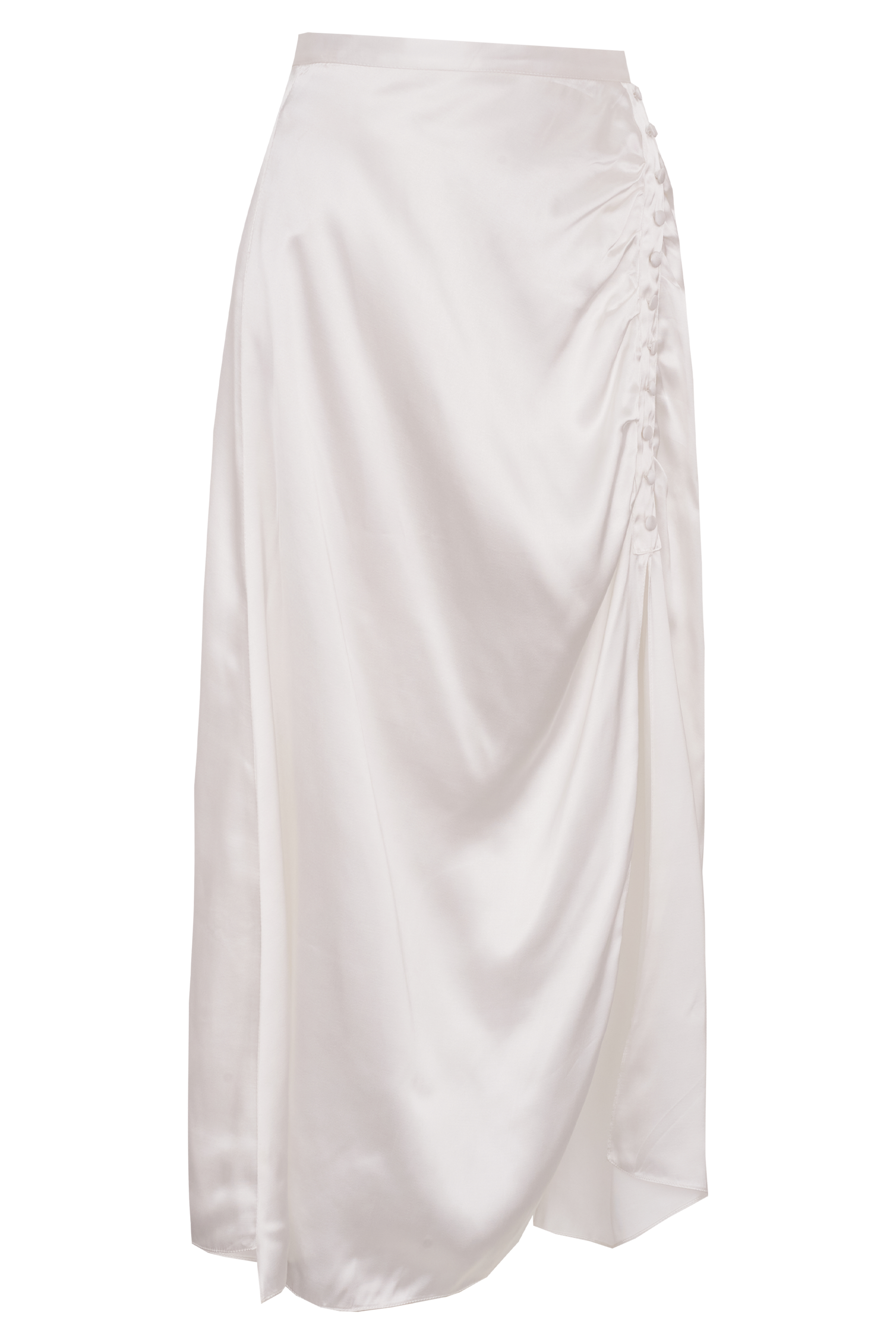 A saia Drape NADRUZ é uma saia abaixo do joelho confeccionada em nosso tecido Nacar, uma viscose bem acetinada. Esta peça evoca sensualidade com sua modelagem assimétrica, cintura alta, botões, fenda no lado esquerdo de quem veste e um drapeado decorativo total. Uma peça não apenas emblemática mas também com um certo charme do passado.