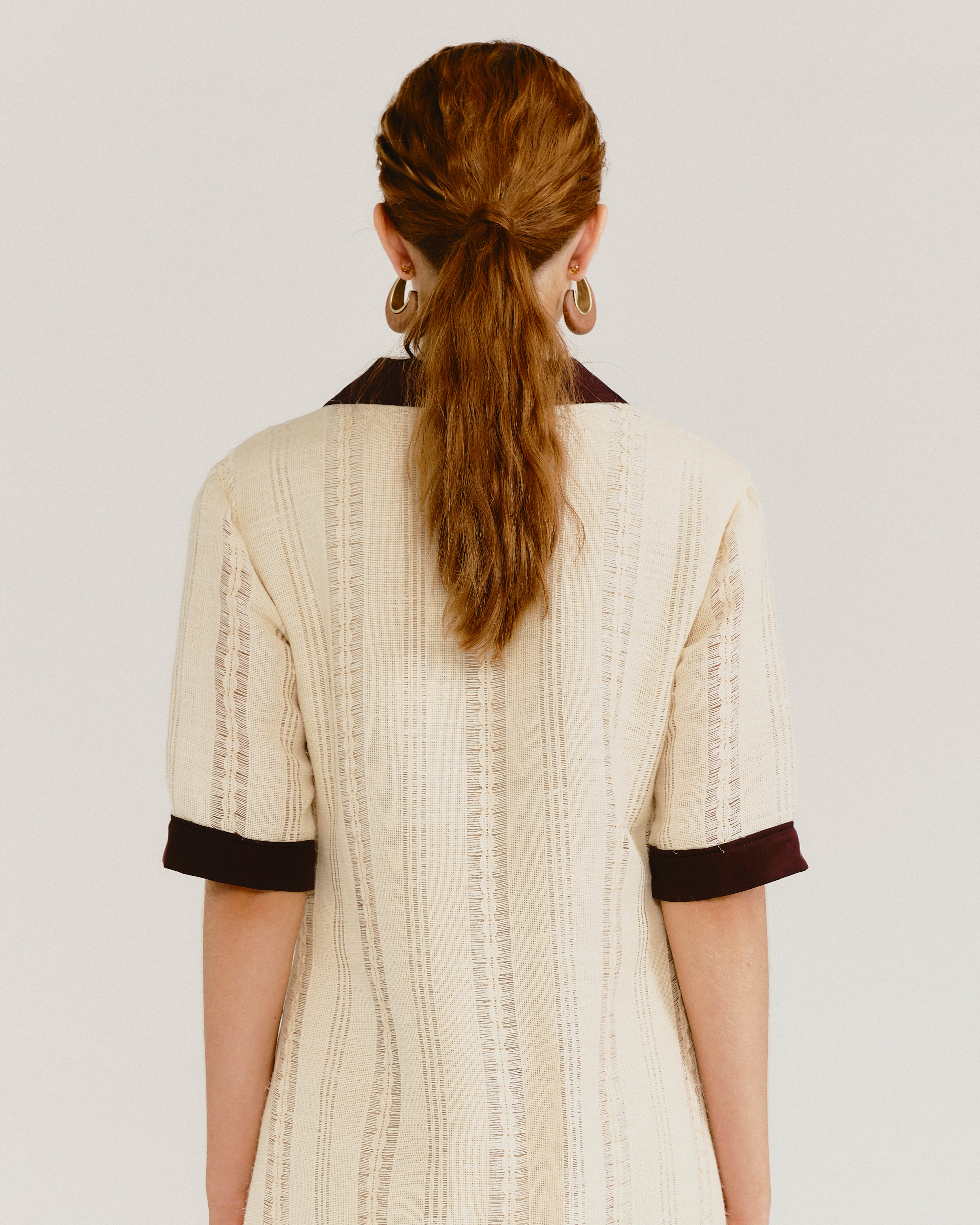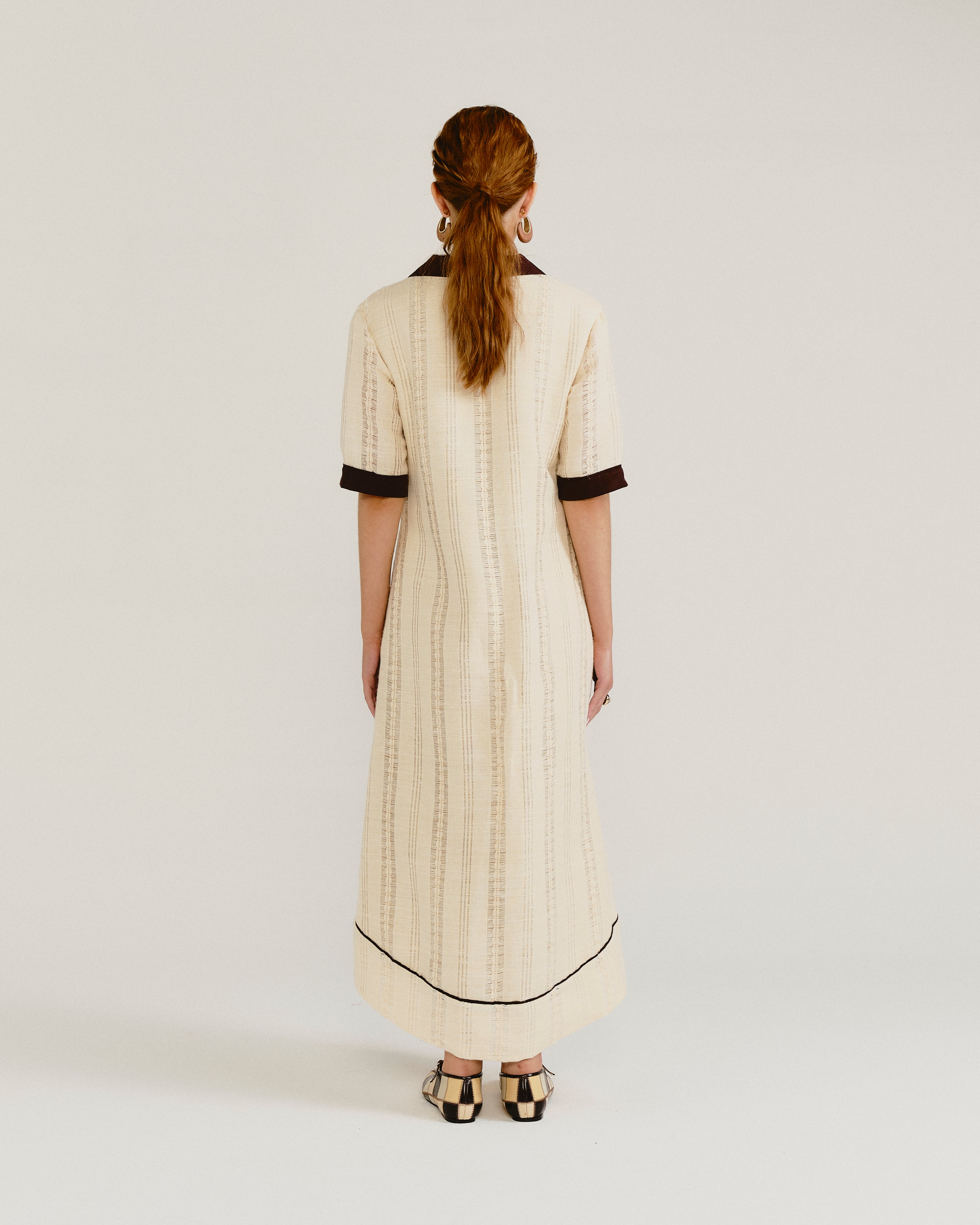 O Vestido Blanca NADRUZ possui um caimento evasê amplo, personificado por gola polo e detalhes pontuais em liocel marrom. Decote V profundo abotoado por 4 botões em madeira, mangas na altura do cotovelo, viés contornando a barra com acabamento abaulado. Confeccionado em tecido maquinetado delicado 100% algodão, com uma lágrima estética.