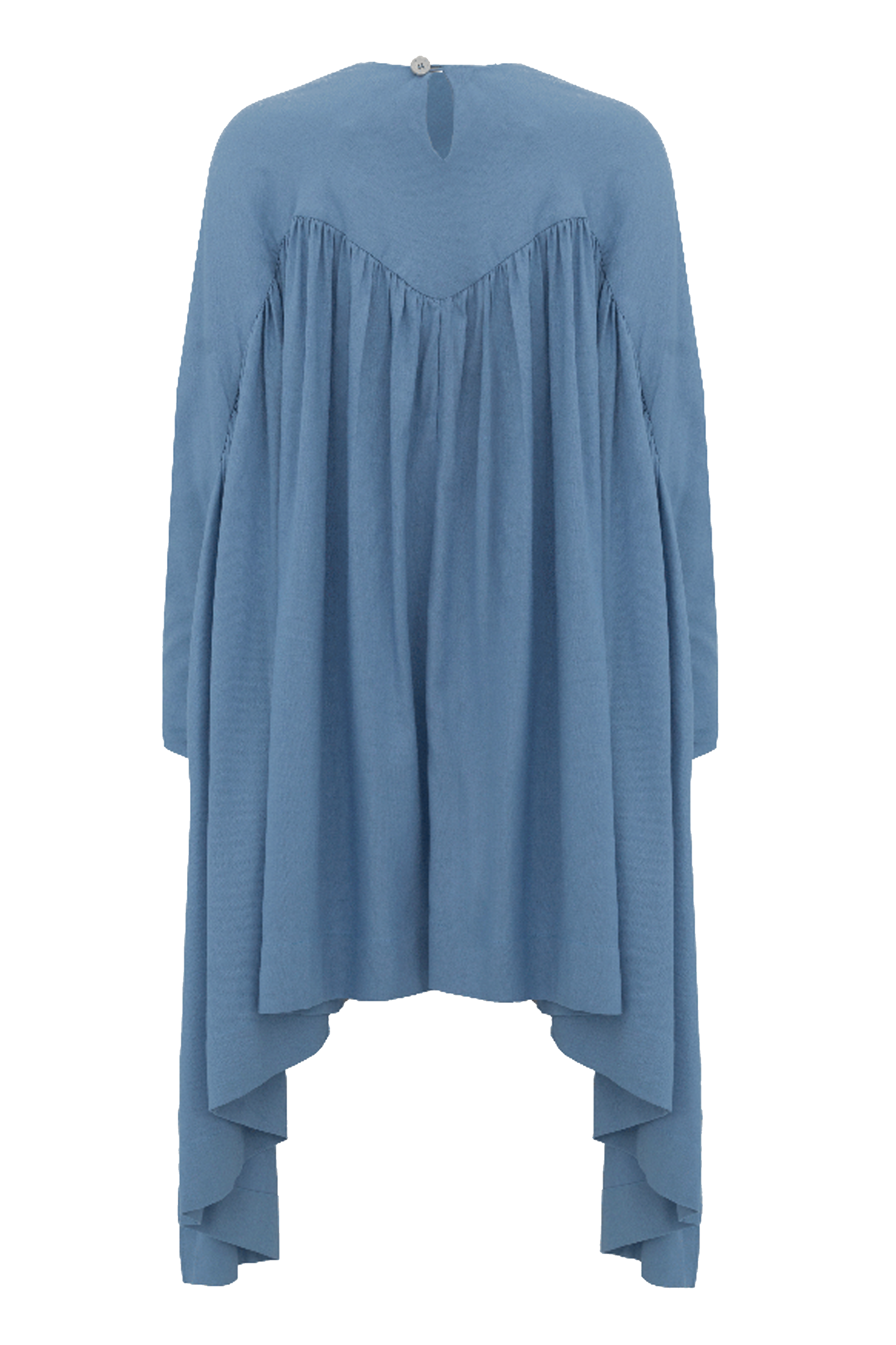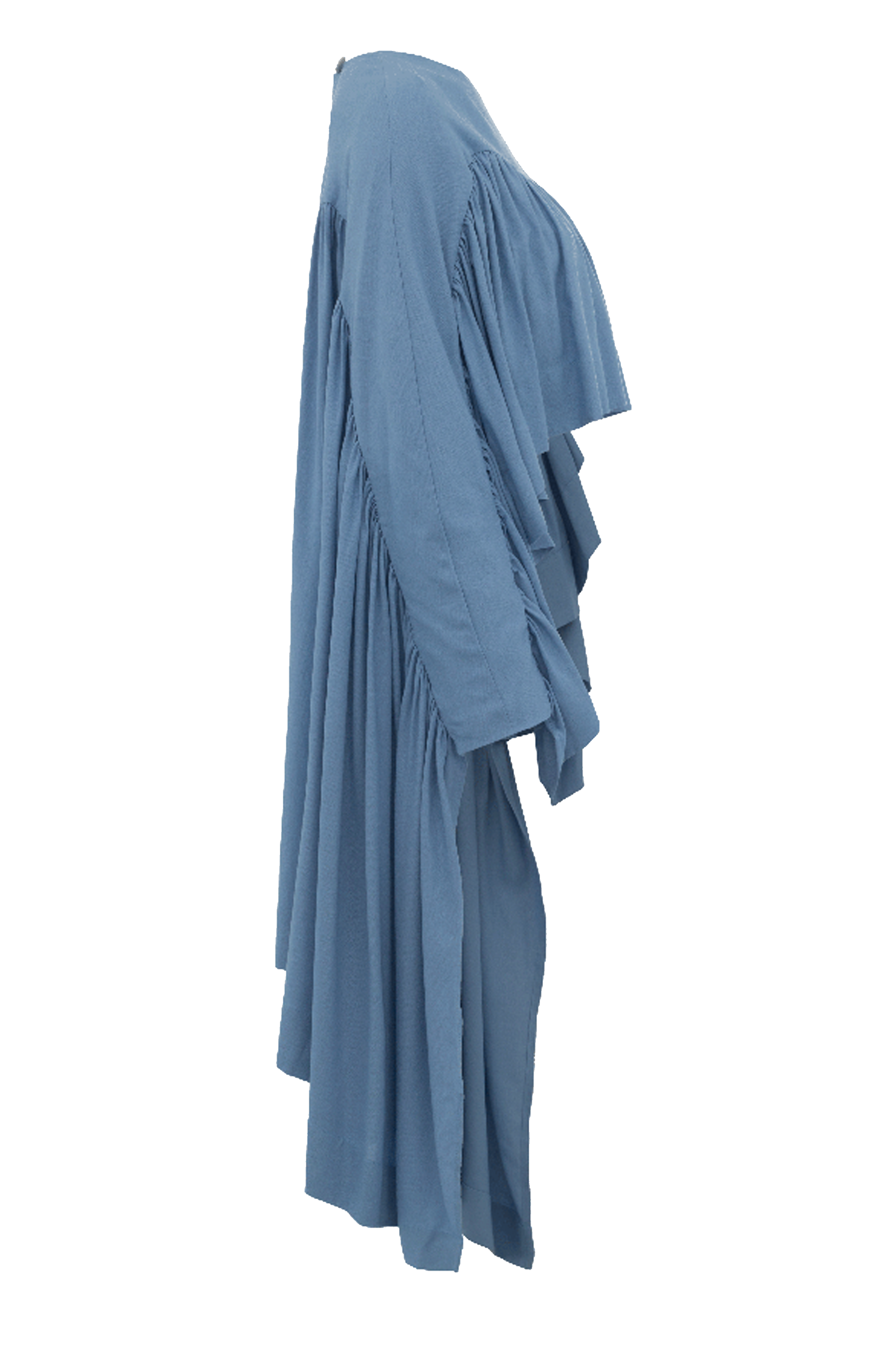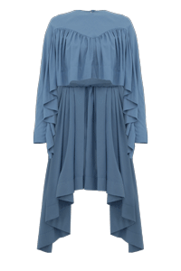 Top com shape amplo formado por babados franzidos e volumosos que se estendem até a manga longa em um único molde. Seu comprimento é cropped na frente e alongado nas costas, criando um efeito de "asa". Possui um top inferior acoplado para melhor segurança e conforto no vestir.